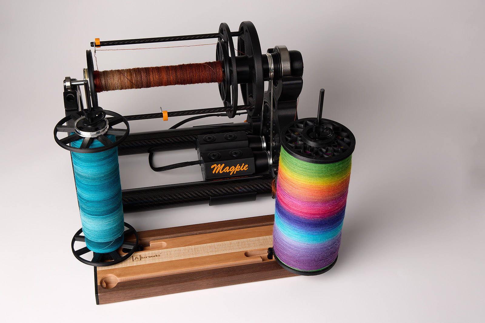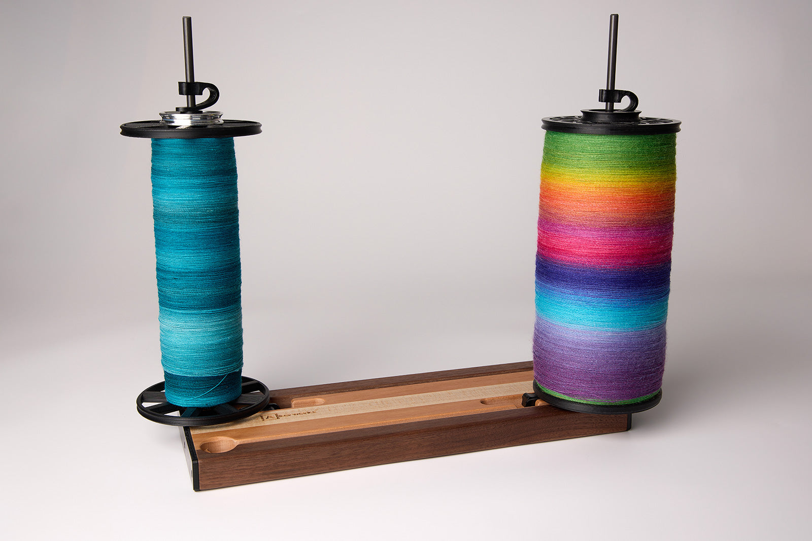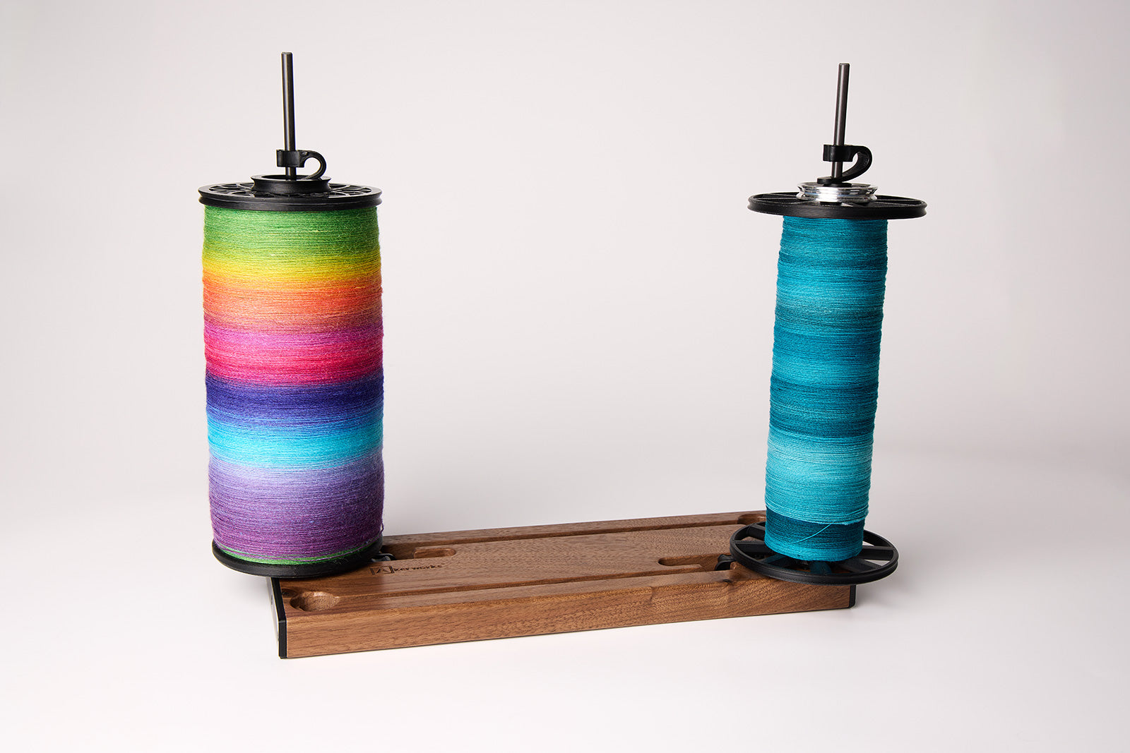 With longer shafts than the classic AkerKate (two at 11.5", 290mm), this Long-Shaft AkerKate accommodates extra-long bobbins such as the Daedalus Magpie, Blackbird, and Starling V1/V2 XL.