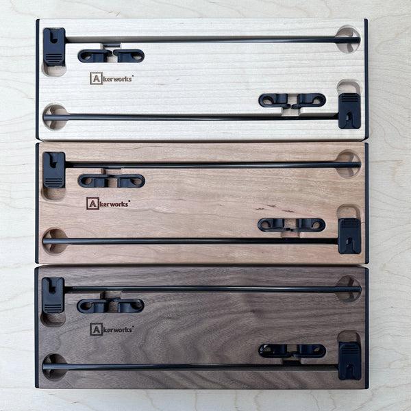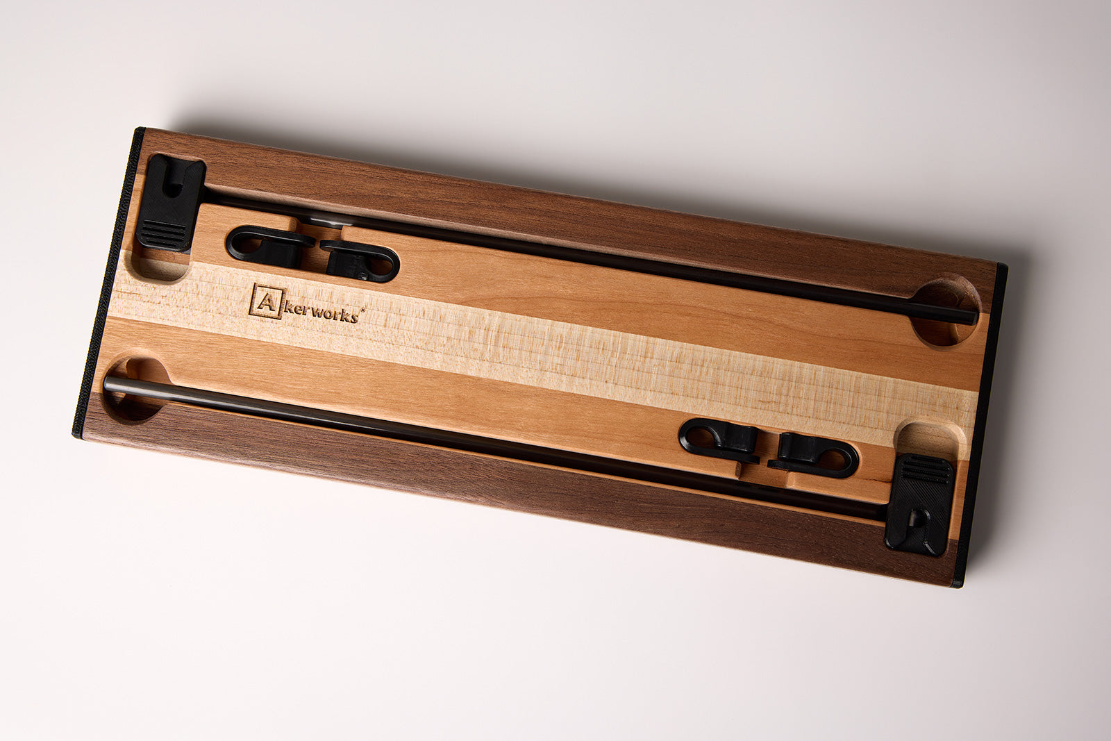 This custom-fabricated Lazy Kate by Akerworks consists of a solid piece of hardwood (American black cherry, hard maple, or black walnut) holding two extended-length carbon fiber shafts. For the Scrappy Kates, please note that due to the nature of their construction, each one is unique.