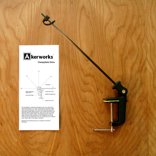The Akerworks ClampyKate Extra is a super versatile mount-anywhere single-shaft tensioned Lazy Kate. The 11.5" (292mm) long carbon fiber shaft and aluminum alloy base are both light and strong. The included TensiTamer, patented rubber tensioning device, allows you to dial in just the right amount of bobbin tension. The adjustable pivot offers 45° angle increment shaft positioning. The ClampyKate can clamp, with non-marring rubber pads, onto any surface up to 2⅛” (54mm) thick: tables, doors, chair backs, whatever!