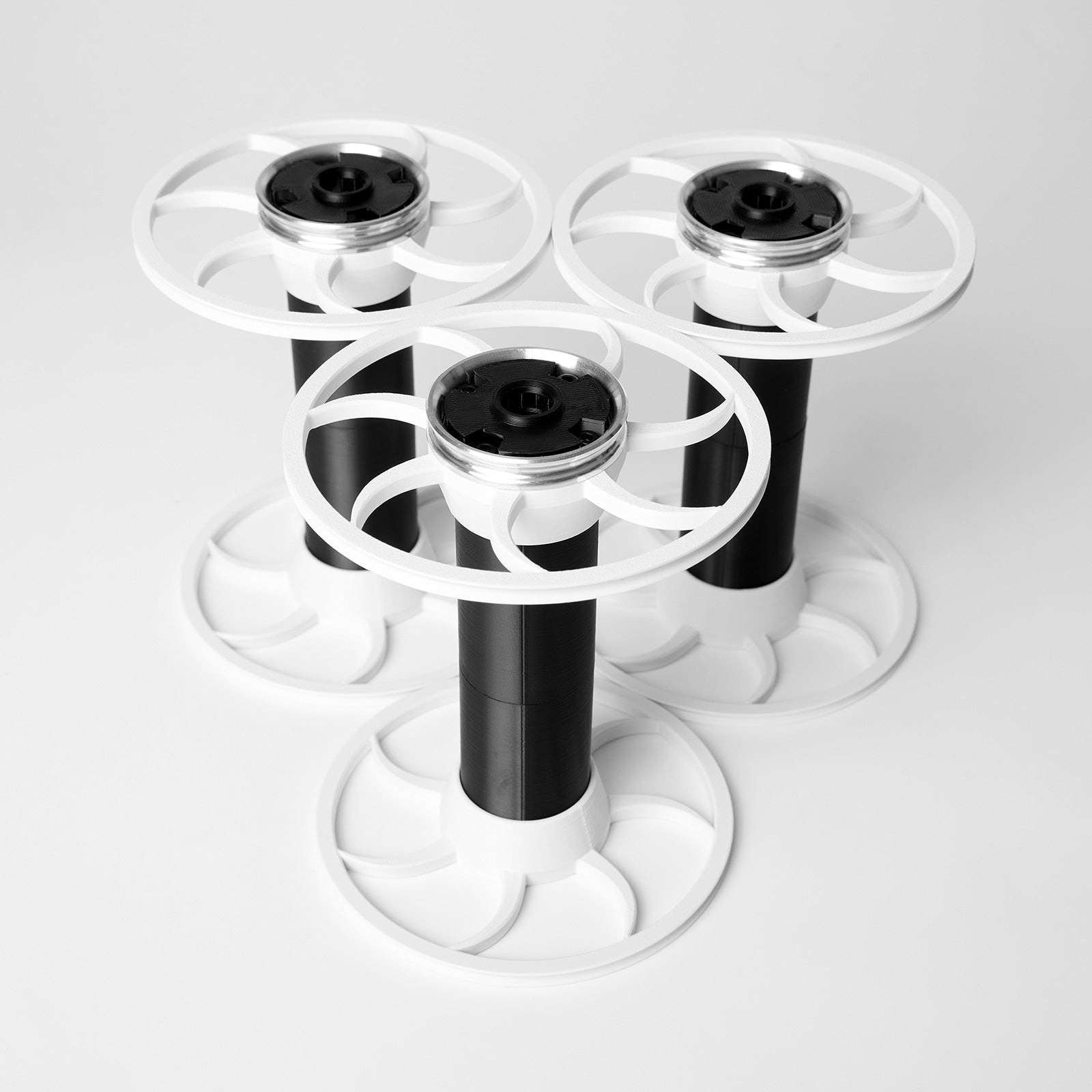 A set of three flat pack bobbins for Starling V3/V3FP Standard and Art Flyer. Only available as White Whorl with Black Core.