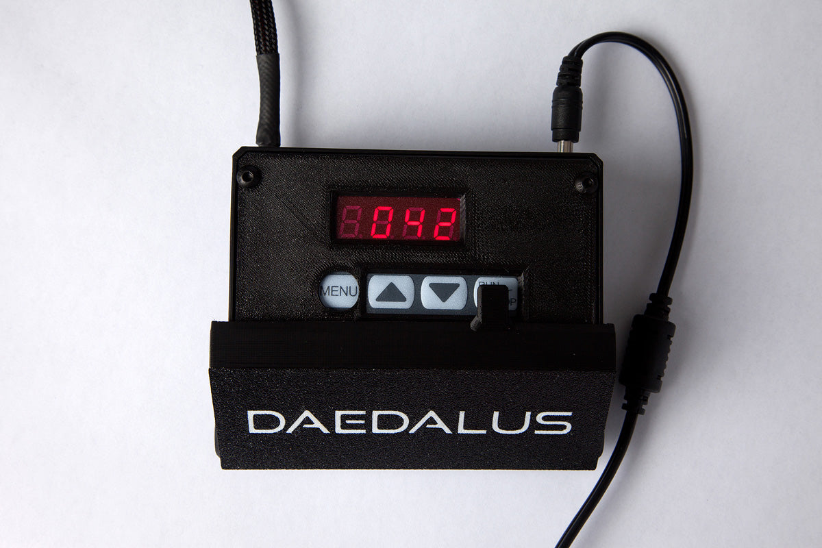 The Daedalus Speed Controller provides highly precise and customizable control based on speeds from 0 to 100%, with programmable incremental increases as low as 1%. It also offers programmable soft start and stop delays, allowing for startup and shut-down times to match your own preferences and your individual projects. For your finest, most consistent laceweight spinning, for instance, you might choose the shortest start delay (to get up and running quickly) but a lengthier, more gentle delay in stopping. Using long delays on that massive plying job you’ve been avoiding helps ensure smoothness in transitions, eliminating backlashing during stopping. Other menu features on our “smart” controllers include minimum and maximum speed limits (providing a top-speed safety net for novice users, for example), and the ability to change the speed adjustment size increment—controlled by pressing Up or Down— from its 1% default up to 2% or even 5%.
