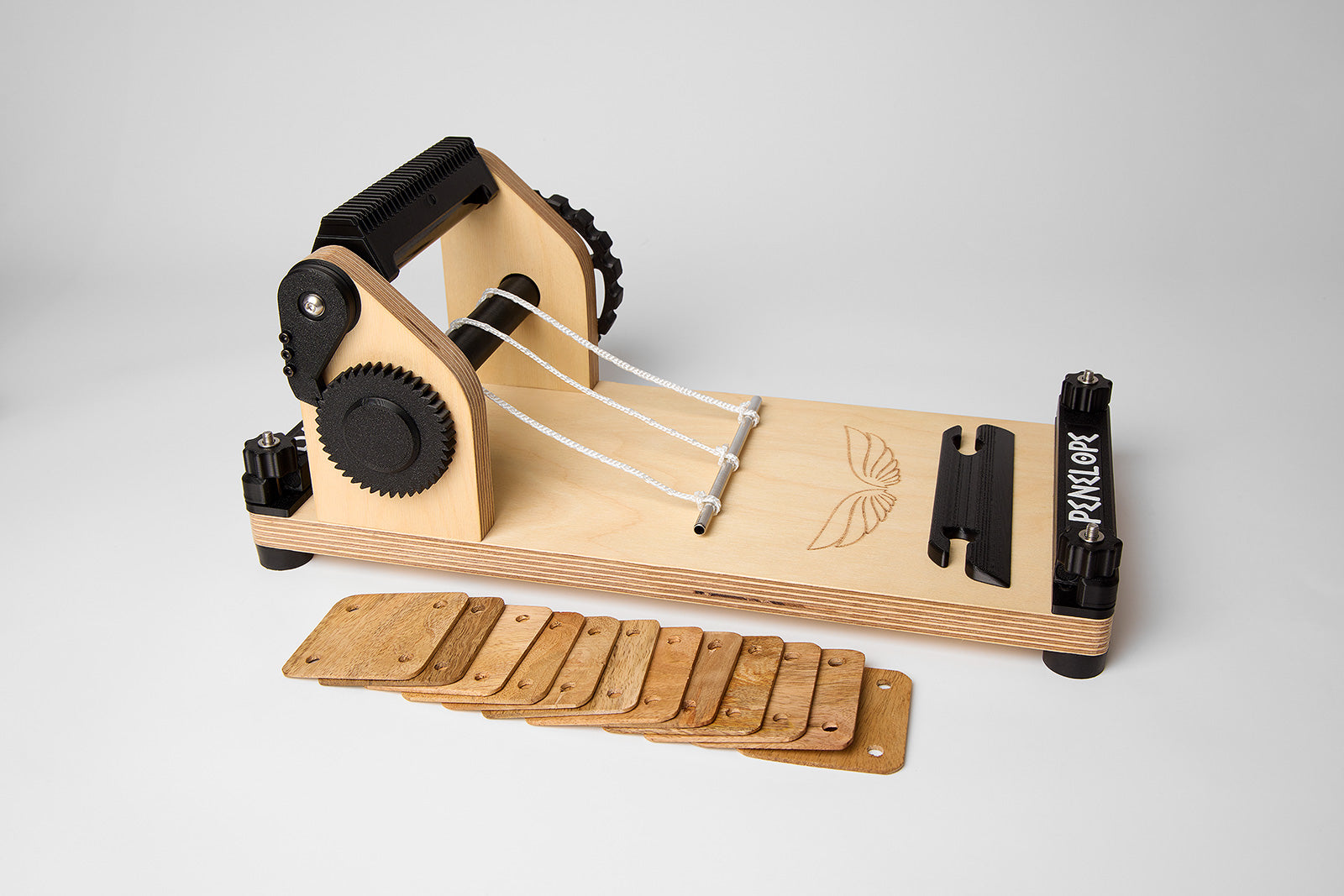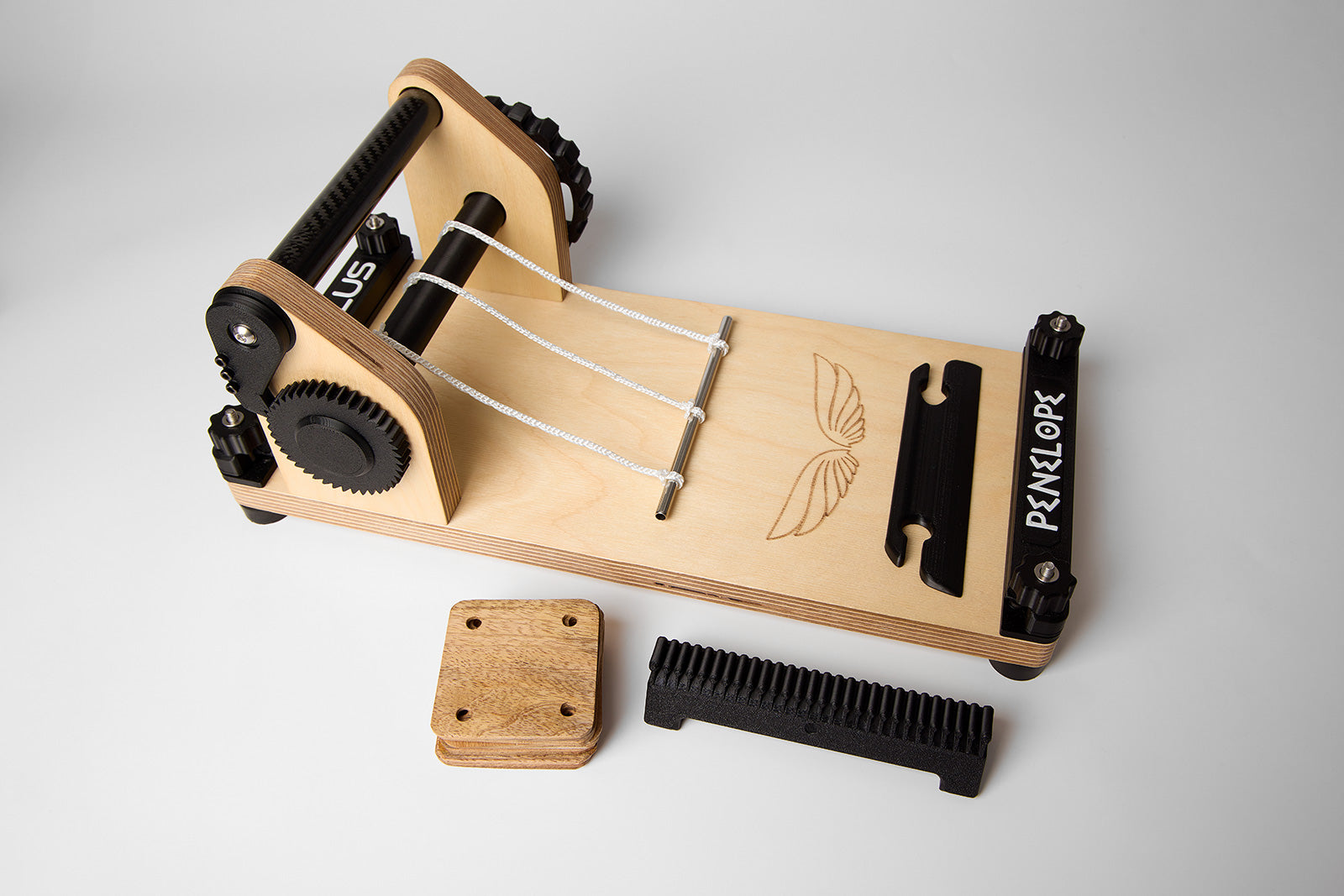 Penelope is a robust band loom made from a beautiful blend of Wood and 3D Printing, with added Carbon Fiber and Precision Steel Linear Rods for military-grade reinforcement of critical parts. Band looms are a hybrid between an inkle and rigid-heddle loom, and are capable of weaving narrow bands with the use of a heddle or tablet cards. Penelope is perfect for weaving thin scarves, belts, shoe laces, camera/purse/guitar straps, and mug rugs (coasters).